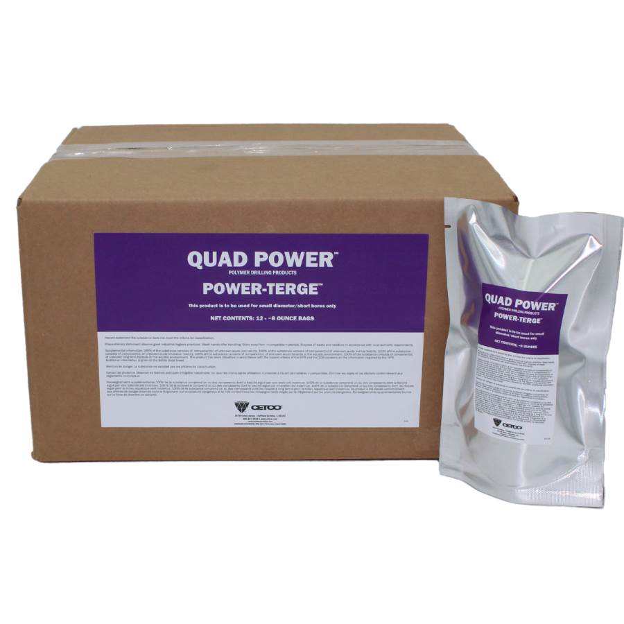 Cetco Quad Power Terge is a highly concentrated, liquid, surfactant/detergent that can either be used with bentonite fluids or can be added to other QUAD POWERâ„¢ polymer drilling products. Used with bentonite, Cetco Quad Power Terge will help prevent rod-sticking and seizing. When added to POWER-BASEâ„¢, it can function to create an extremely high-performance slurry for clay drilling. The product is highly concentrated, so very little is used compared to most other detergents.