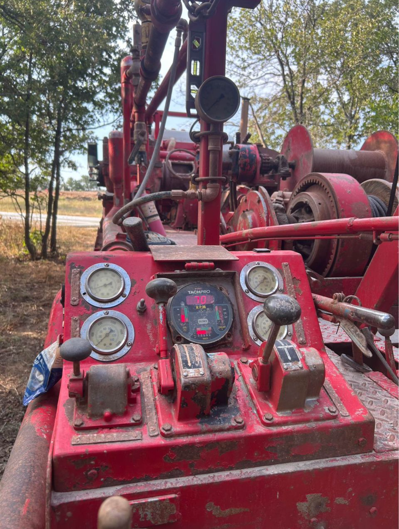 The rig features a retractable 5 ¼” Failing table and a 40-foot mast, supported by four leveling jacks for excellent stability. It’s equipped with a 5×6 Failing mud pump and a 100 SDS LeRoi compressor to handle your drilling needs. Power is supplied by a 500hp Spicer PTO, ensuring ample force for tough conditions.