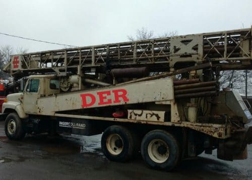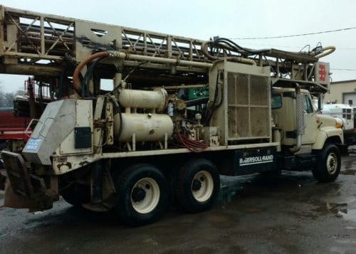 The T3W Waterwell Drill was manufactured in 1999 by Ingersoll-Rand and mounted on International 2654. The T3W Waterwell Drill has a IR 900 cfm @350 psi HR2 compressor, Powered by CAT 3406 with 7,800 hours, 32 ft Deephole Tower with 32, 500 lb pullback, High torque single speed rotary head 8,000 ft-lbs of torque. 12-GPM water injection, 7-Gallon DHD Lubricator, 660 ft of 4.5″ Drill Pipe, 7 Rig Carousel, Single Rod Loader, Rod Spinner, 18k Main Winch.