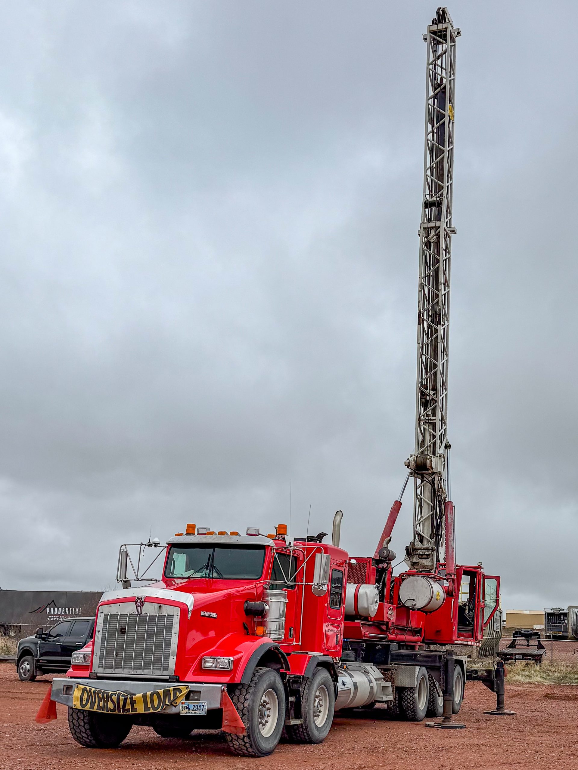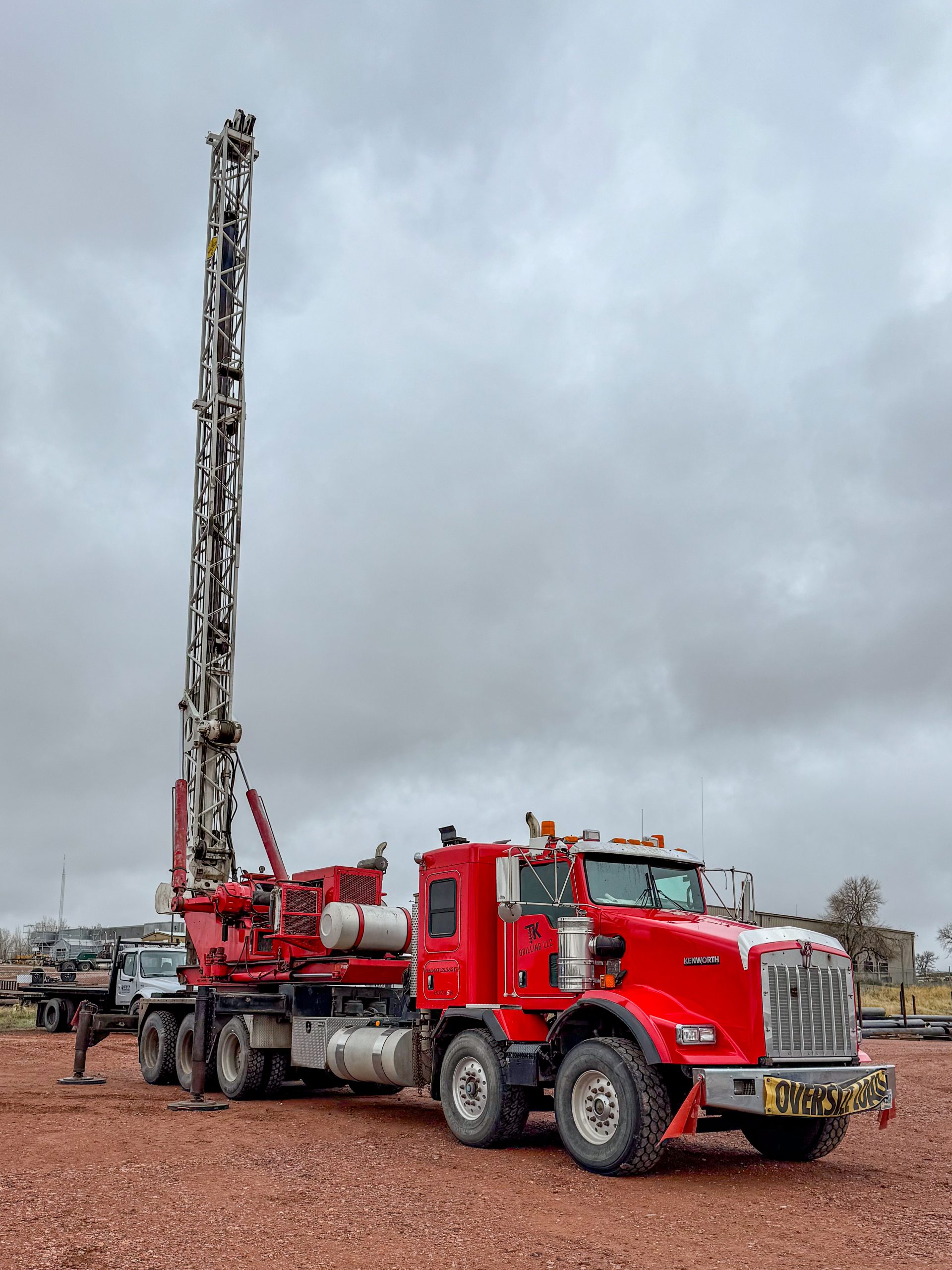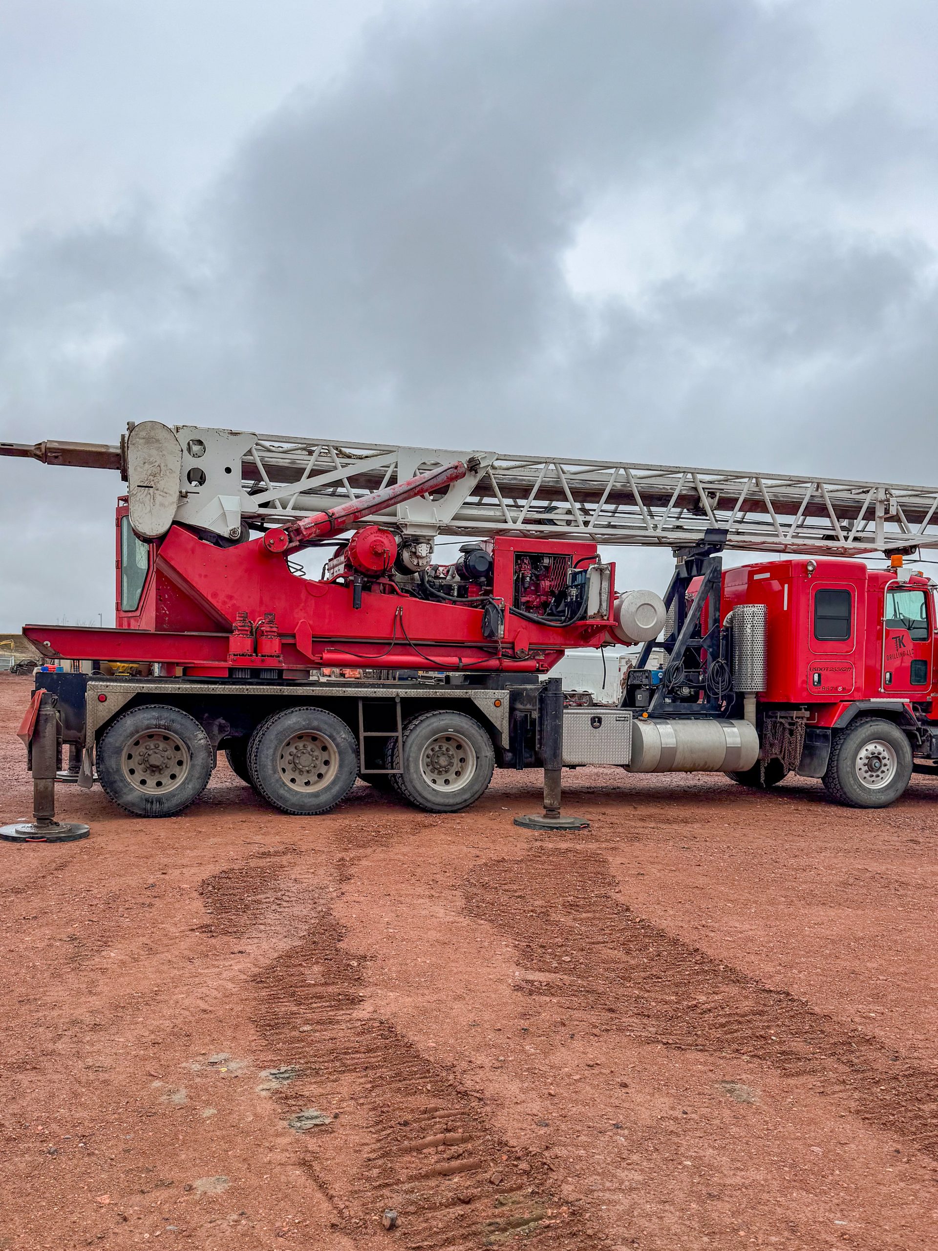 The rig is mounted on a rugged Kenworth T800 chassis designed for maximum stability and off-road capability. Featuring a tri-drive and twin steer configuration, this truck provides the weight distribution and maneuverability needed to navigate tight job sites while carrying a massive drilling package.